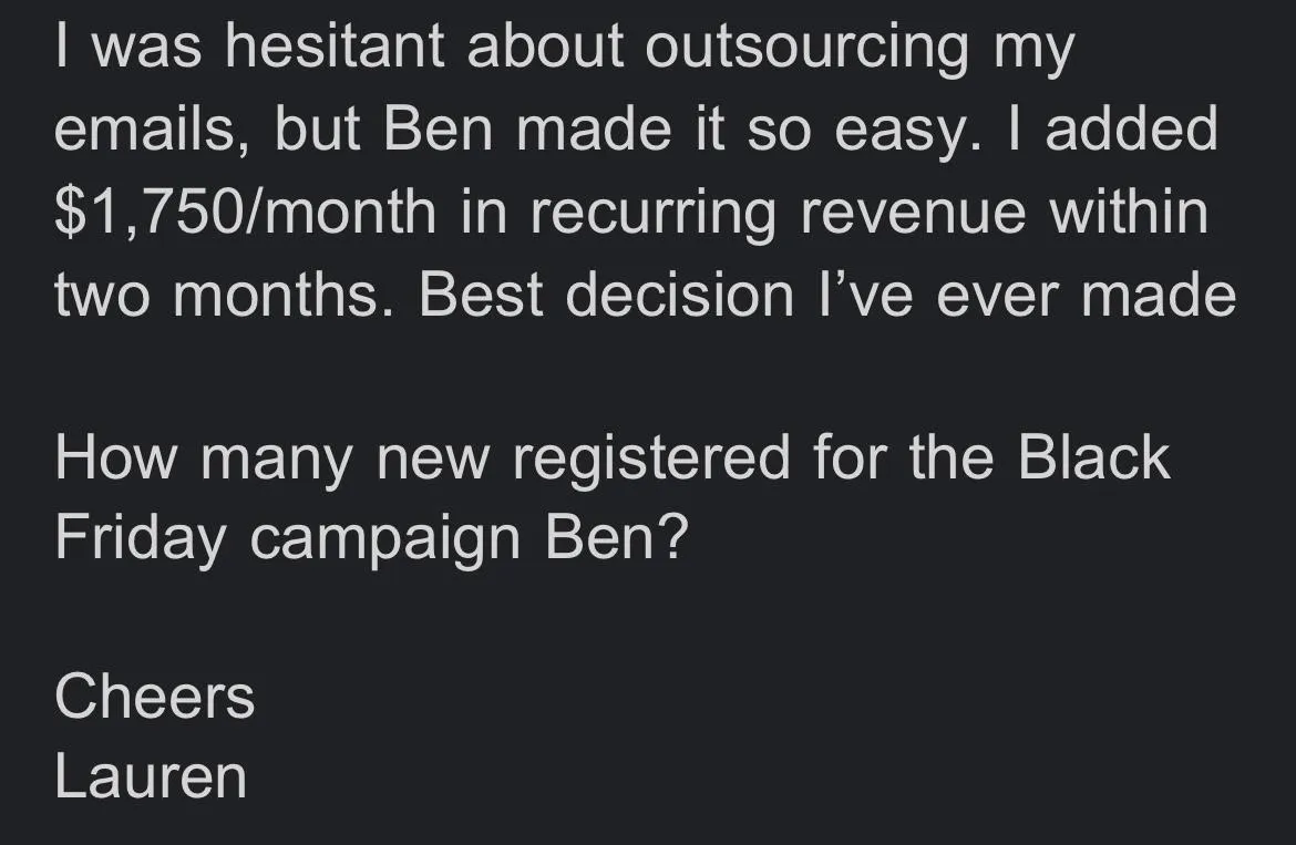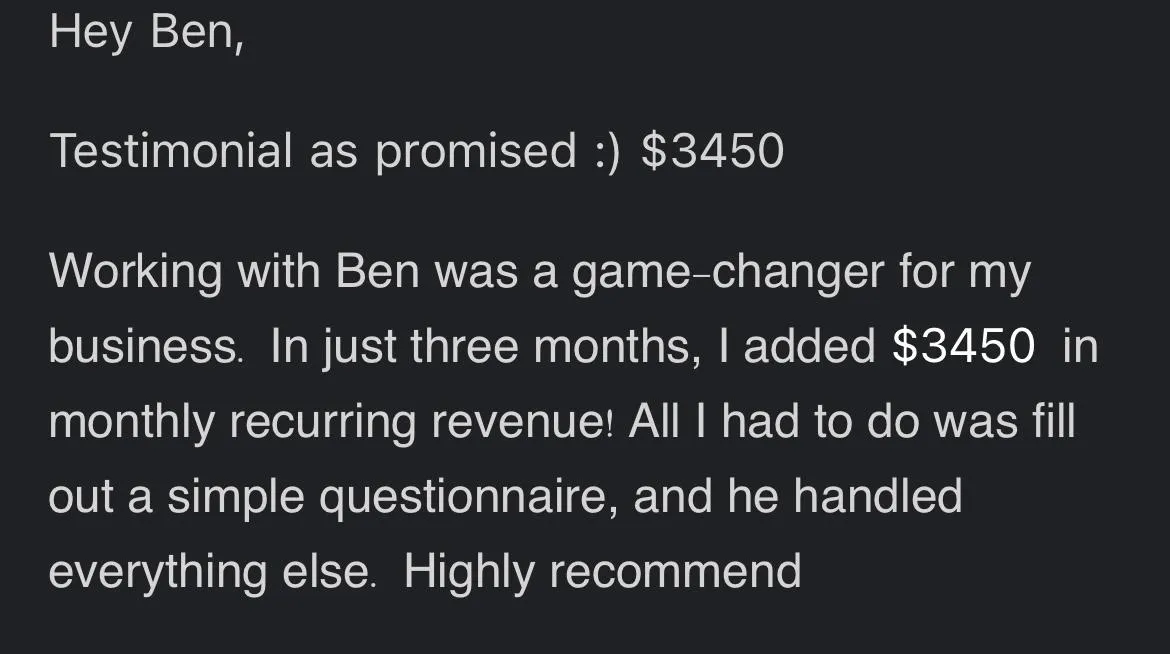 With these systems in place, Ben was no longer relying on inconsistent outreach and unpredictable word-of-mouth referrals —his business now had a scalable, automated growth engine.